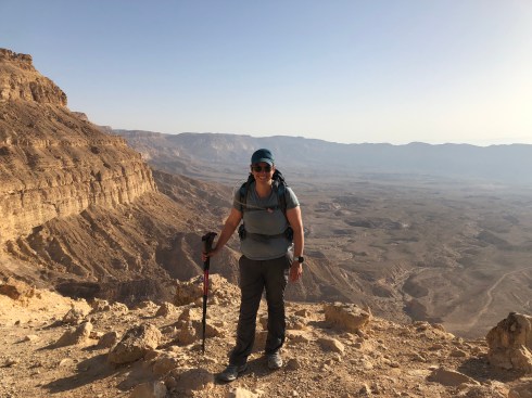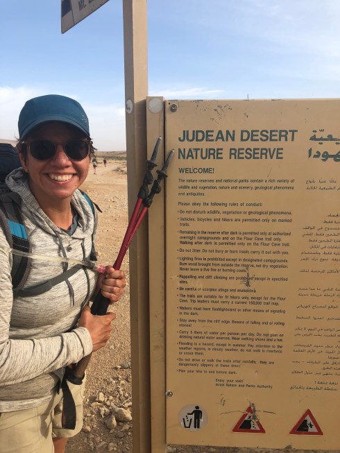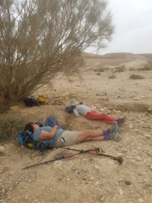 On Monday, I walked through the last of the craters in the Negev…Makhtesh Katan (the small crater. It definitely felt like the friendliest of all the craterim. It is the most symmetrical and had gorgeous sparkly red purplish sand. The past two days I’ve walked primarily on a Jeep road with mountains on either side.